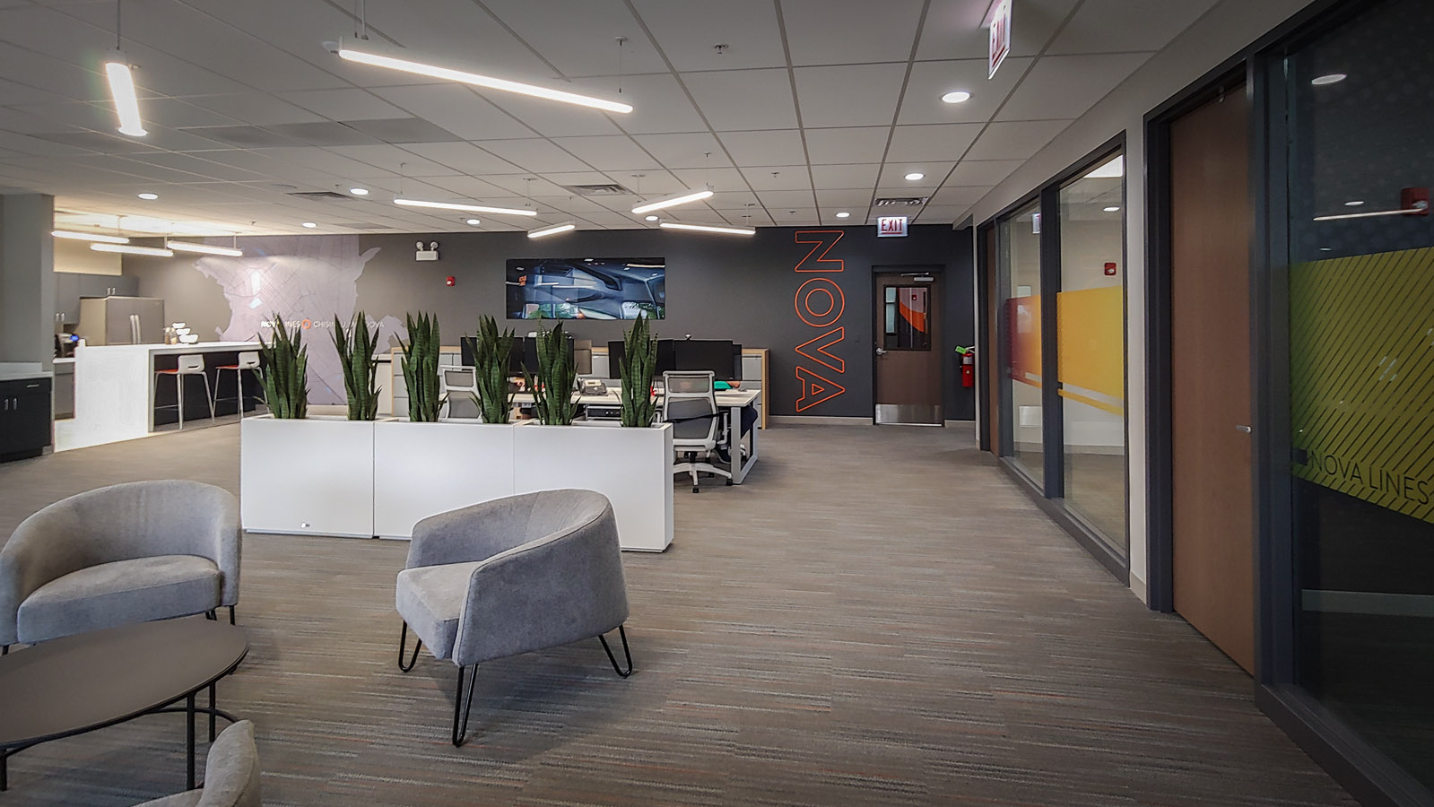 Nova Lines is a rapidly expanding, premier flatbed trucking company dedicated to excellence in the logistics sector. As they relocated their headquarters to a larger facility in Bridgeview, Illinois, they sought to enhance their brand identity within this new space. With an established logo and color palette, Nova Lines engaged Cornerstone Architects to amplify their brand through innovative interior design. Our team provided comprehensive project management, strategic consultation, and creative services, including design and photography.